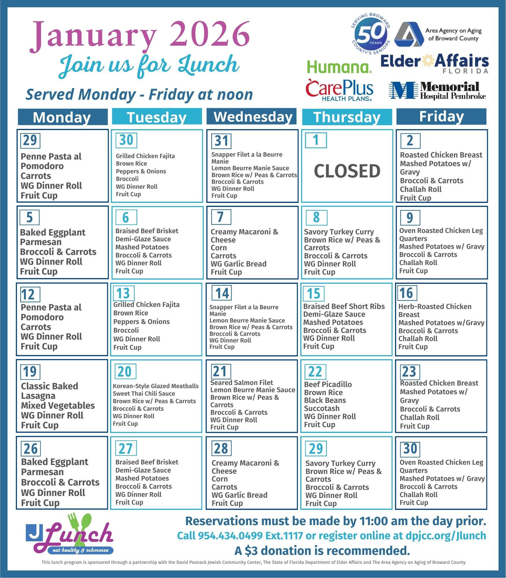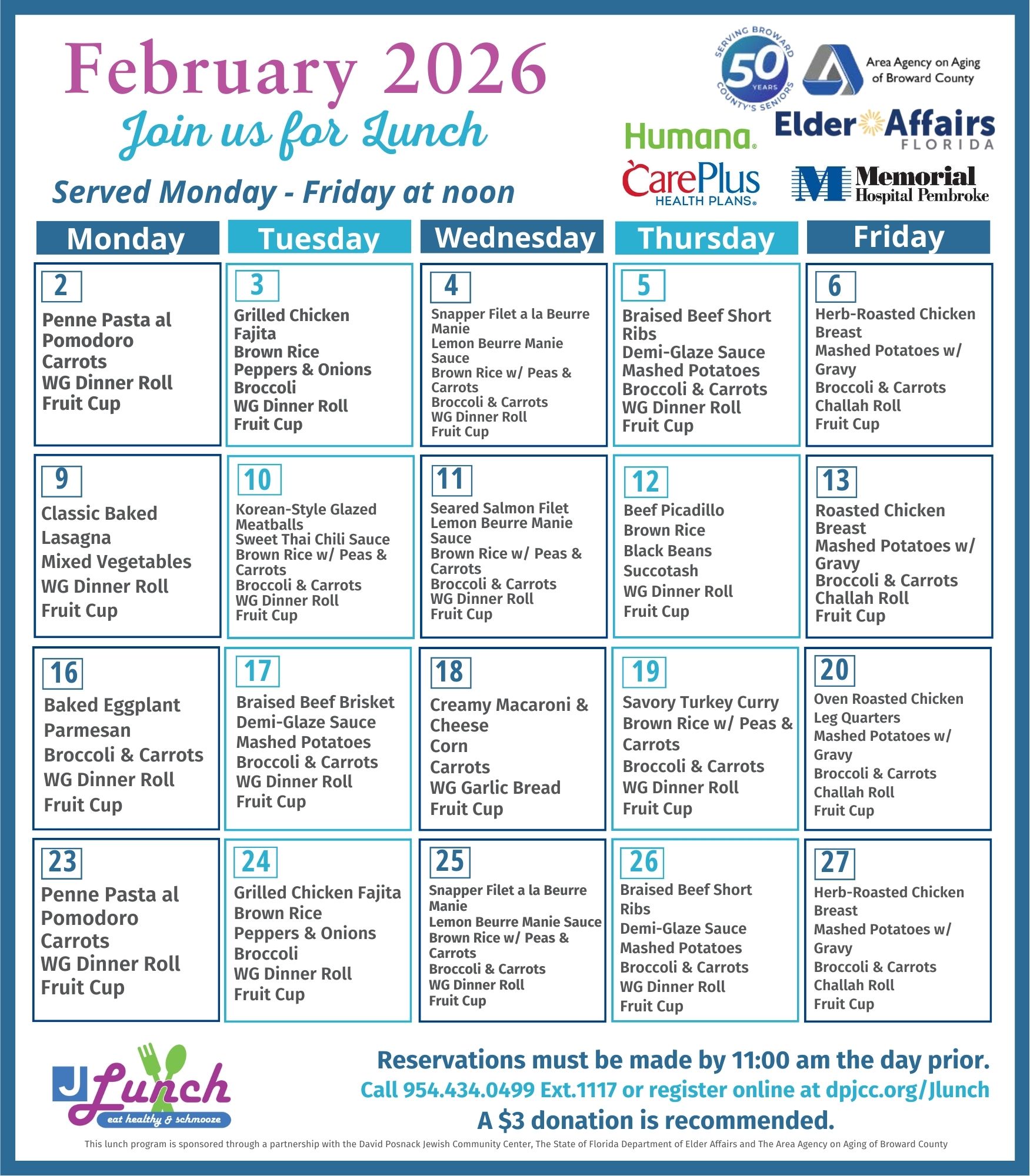The lunch program is sponsored through a partnership with the David Posnack Jewish Community Center, The State of Florida Department of Elder Affairs and The Area Agency on Aging of Broward County.